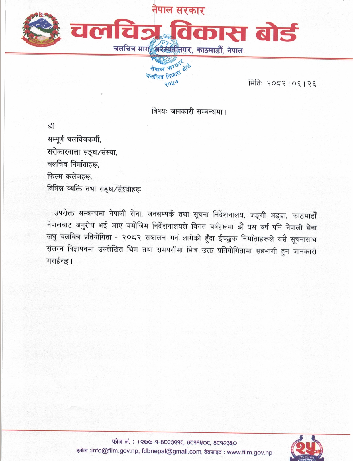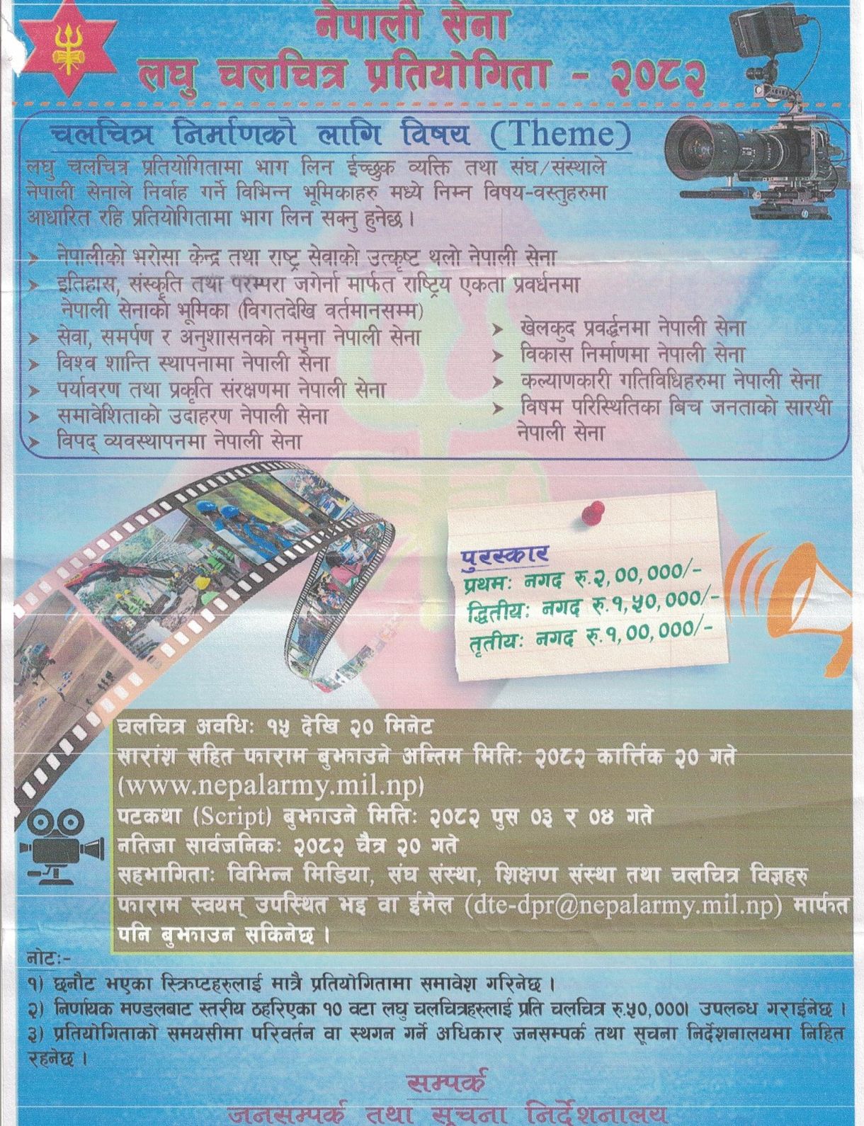 उपरोक्त सम्बन्धमा नेपाली सेना, जनसम्पर्क तथा सूचना निर्देशनालय, जङ्गी अड्डा, काठमाडौँ नेपालबाट अनुरोध भई आए बमोजिम निर्देशनालयले विगत वर्षहरूमा झैँ यस वर्ष पनि नेपाली सेना लघु चलचित्र प्रतियोगिता - २०८२ सञ्चालन गर्न लागेको हुँदा ईच्छुक निर्माताहरूले यसै सूचनासाथ संलग्न विज्ञापनमा उल्लेखित थिम तथा समयसीमा भित्र उक्त प्रतियोगितामा सहभागी हुन जानकारी गराईन्छ।