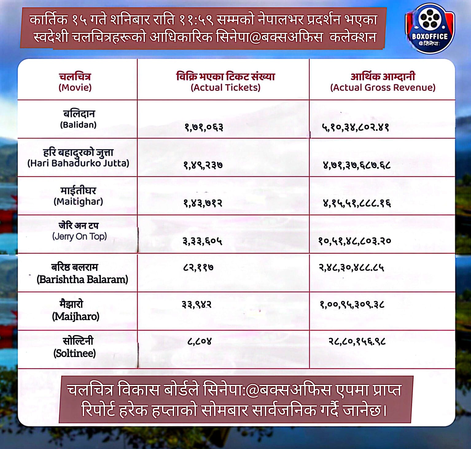 साप्ताहिक बक्स अफिस रिपोर्ट – मिति २०८२ कार्तिक १५ गते, शनिबार, ११ः५९ राति सम्मको आधिकारिक कलेक्सन