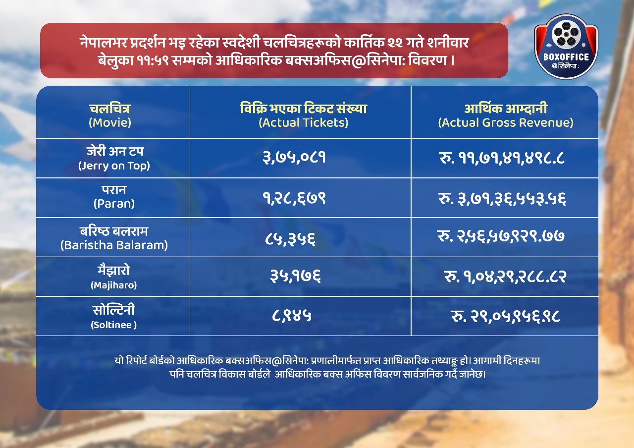 साप्ताहिक बक्स अफिस रिपोर्ट – मिति २०८२ कार्तिक २९ गते शनिबार, ११ः५९ राति सम्मको आधिकारिक बक्स अफिस रिपोर्ट @सिनेपाः, कलेक्सन