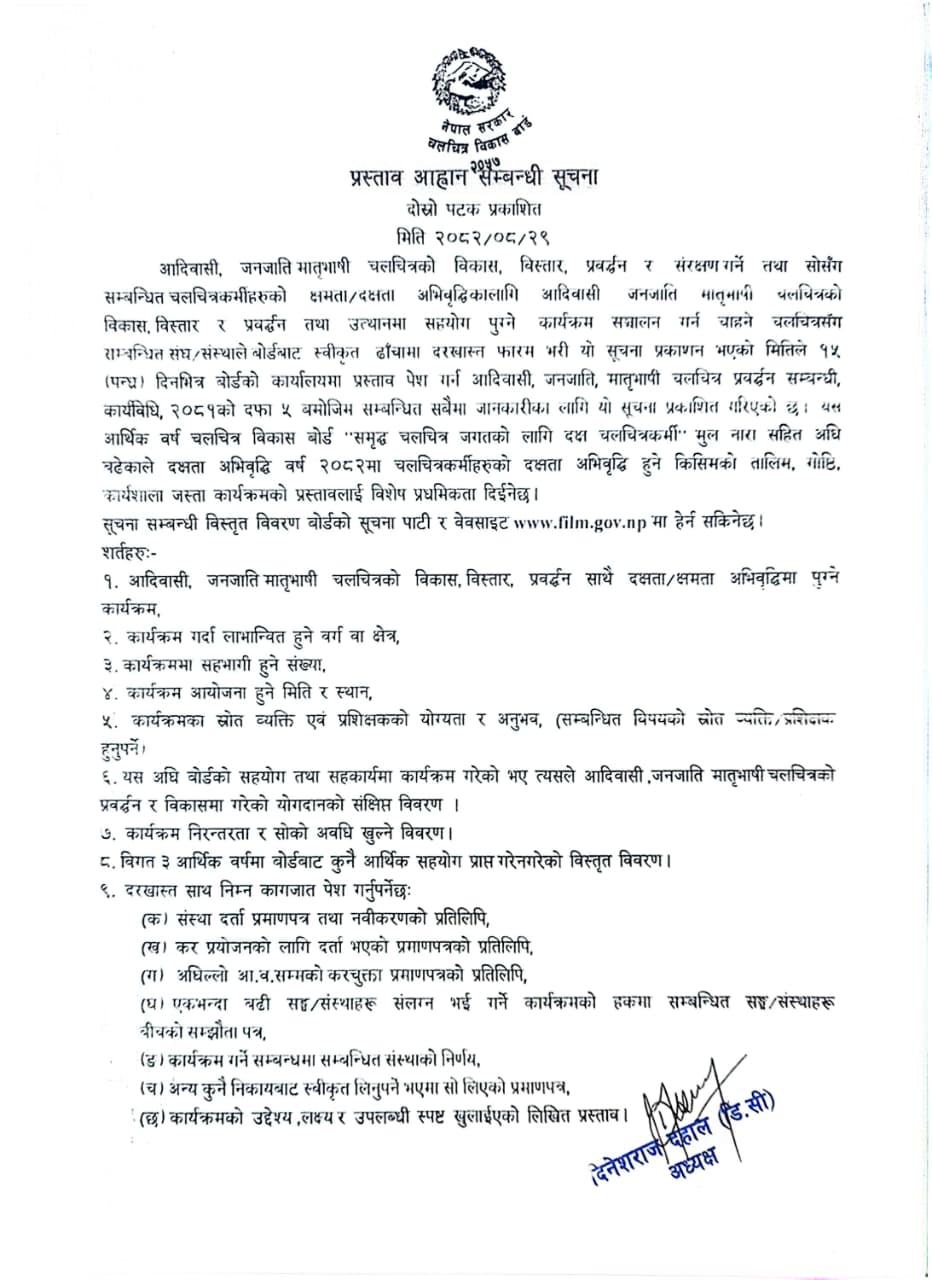 आदिवासी, जनजाति मातृभाषी चलचित्रको विकास, विस्ता, प्रवर्द्धन   संरक्षण गर्ने तथा सोसँग सम्बन्धित चलचित्रकर्मीहरुको क्षमता/दक्षता अभिवृद्धिकालागि आदिवासी  जनजाति मातृभाषी चलचित्रको विकास, विस्तार र प्रवर्द्धन तथा उत्थानमा सहयोग पुग्ने  कार्यक्रम सञ्चालन गर्न चाहने चलचित्रसँग सम्बन्धित संघ/संस्थाले बोर्डबाट स्वीकृत  ढाँचामा दरखास्त फारम भरी यो सूचना प्रकाशन भएको मितिले १५ (पन्ध्र) दिनभित्र बोर्डको कार्यालयमा प्रस्ताव पेश गर्न आदिवासी, जनजाति, मातृभाषी चलचित्र प्रवर्द्धन सम्बन्धी, कार्यविधि, २०८१को दफा ५ बमोजिम सम्बन्धित सबैमा जानकारीका लागि यो सूचना प्रकाशित गरिएको छ। यस आर्थिक वर्ष चलचित्र विकास बोर्ड ''समृद्ध चलचित्र जगतको लागि दक्ष चलचित्रकर्मी'' मुल नारा सहित अघि बढेकाले दक्षता अभिवृद्धि वर्ष २०८२मा चलचित्रकर्मीहरुको दक्षता अभिवृद्धि हुने किसिमको तालिम, गोष्ठि, कार्यशाला जस्ता कार्यक्रमको प्रस्तावलाई विशेष प्रधमिकता दिईनेछ।