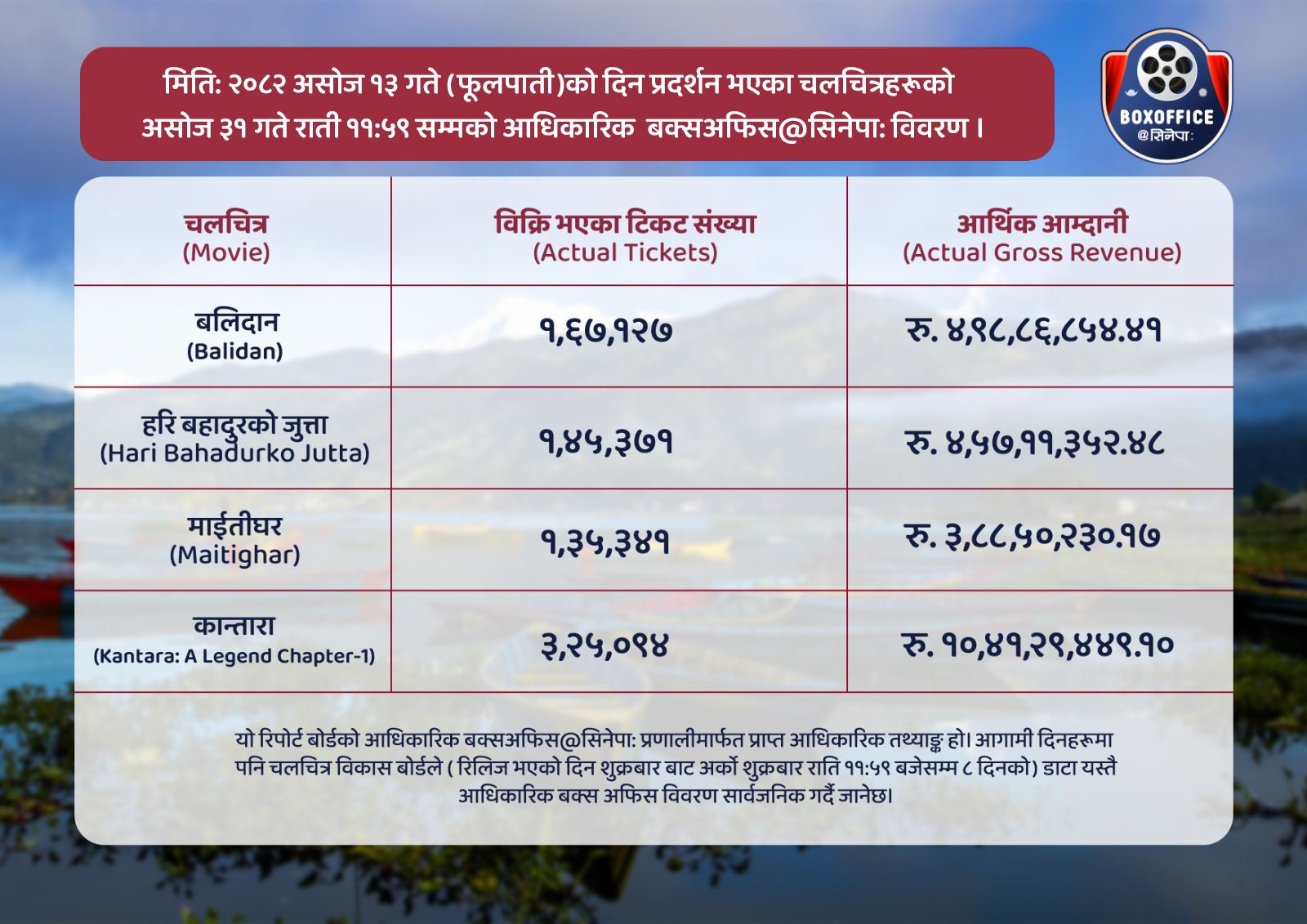 | मिति २०८२ असोज १३ गते (फुलपाती) प्रदर्शित चलचित्रहरूको असोज ३१ गते राति ११:५९ सम्मको आधिकारिक बक्स अफिस विवरण